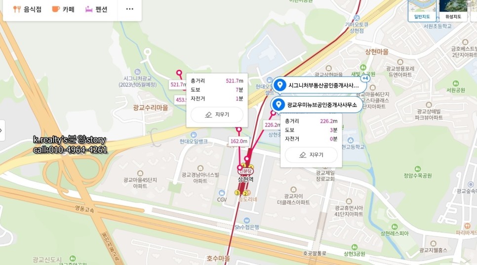 광교 상현역 우미뉴브 와 광교시그니처1차 입니다. 우미뉴브는 상현역 에서 약 230m 그리고 광교시그니처1차는 약 520m정도 입니다.