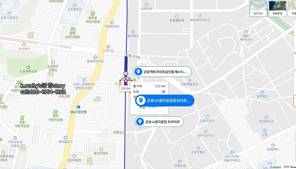 군포 트리아츠 지식산업센터 입니다. 군포역에서 약 120m로 나타나며 실제로 임장을 가보면 약 150m~200m 내외로 측정 됩니다.